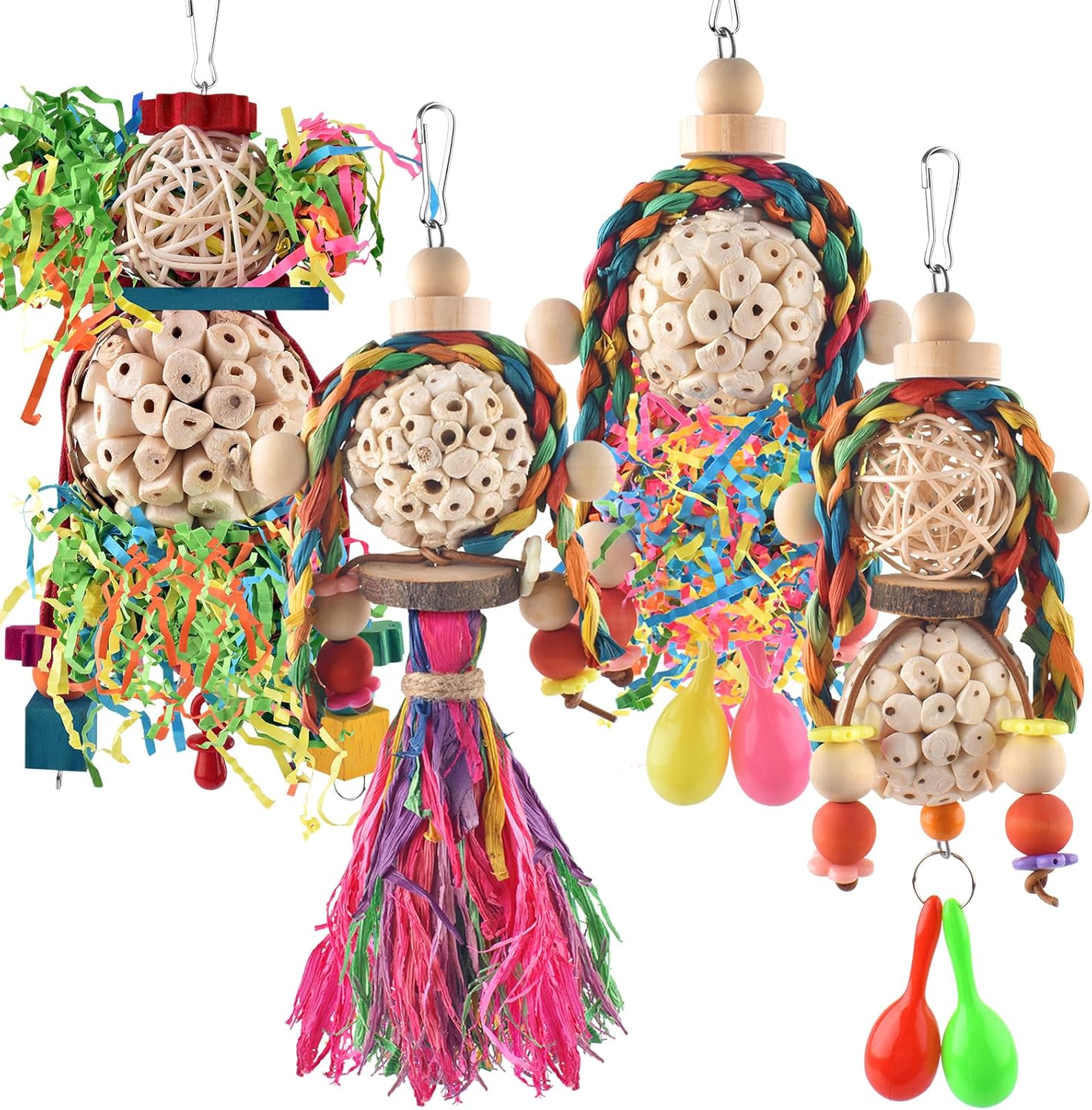 - Suitable Birds' Size: 4 peice parrot chew toys suitable for small and medium-sized birds, such as Cockatiels, Finches, Lovebirds, Conures, Parakeets, etc