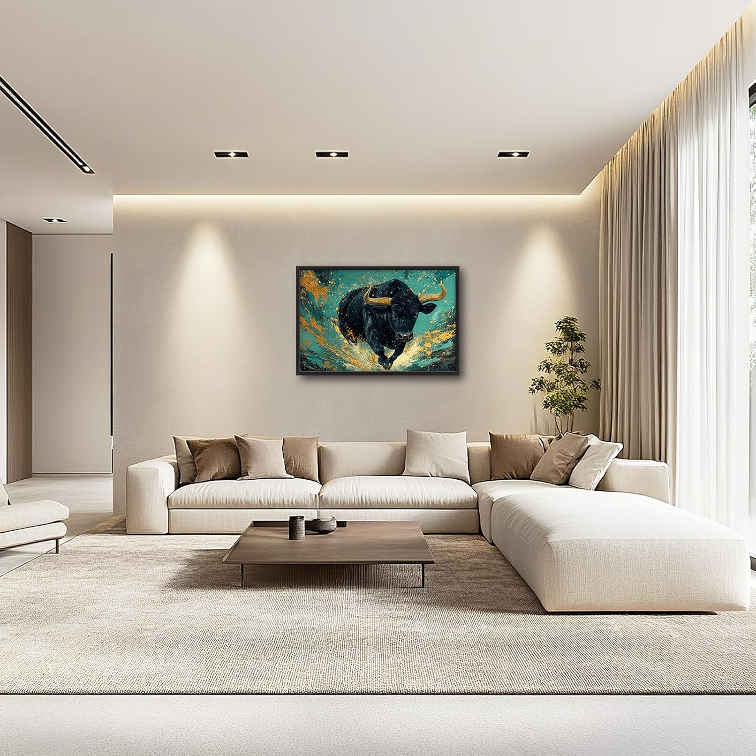 Large Bison Buffalo Wall Art for Living Room, Framed Oversized Bull Wall Decor, Abstract Teal and Golden Canvas Painting Modern Artwork for Living Room Bedroom Office Dining Room 36"x24"