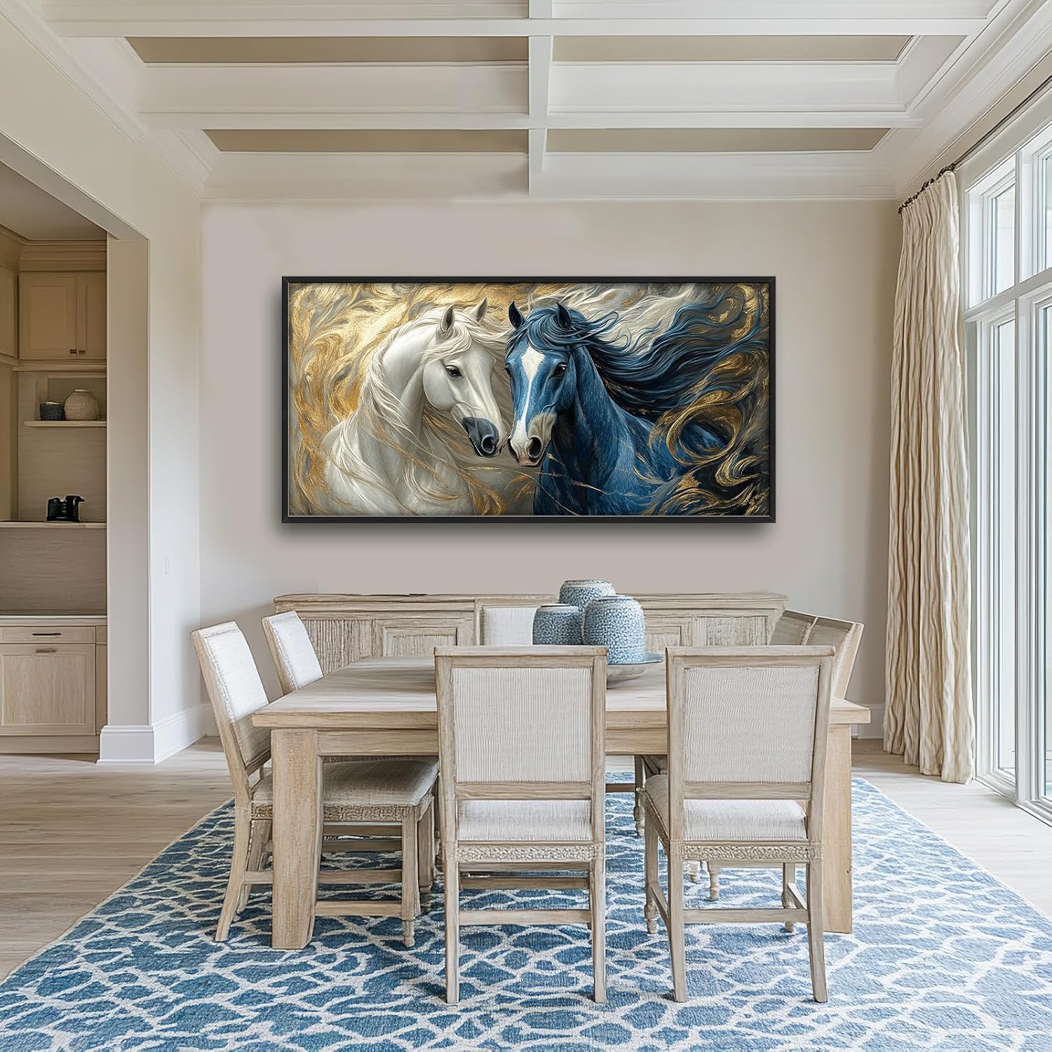 Framed Large Horse Wall Art for Living Room, Oversized Abstract Horses Wall Decor Blue and Golden Canvas Painting Animal Pictures Modern Artwork for Living Room Bedroom Office 60"x30"