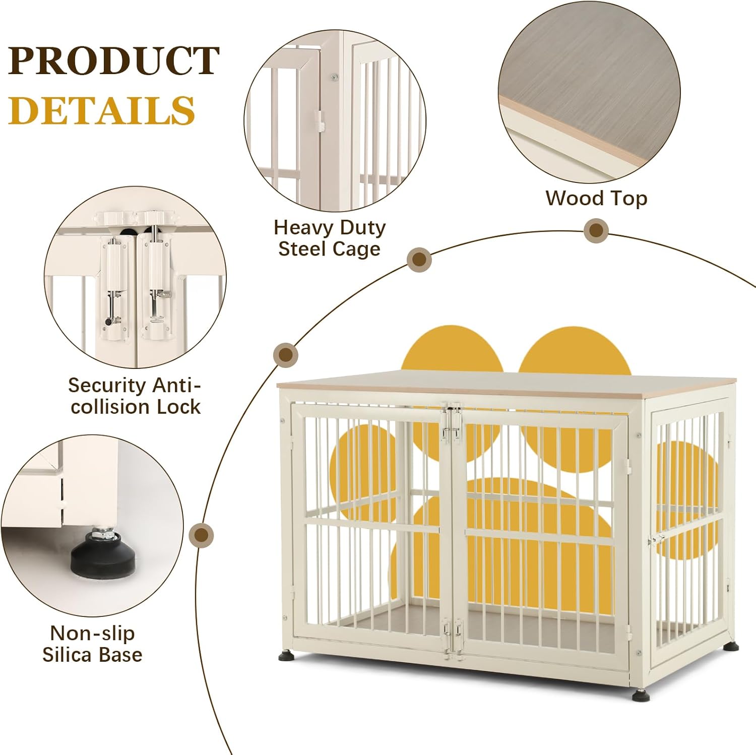 - Sturdy and Chew-Resistant: The design of the thickened metal fence can effectively prevent dogs from chewing, increase the firmness and not easy to deform. The large dog crate combines heavy-duty wood panels and metal to ensure sturdy and stable for long-term use. The top provides extra storage space for pet supplies and other decorative items. The top supports a maximum weight of 200 lbs