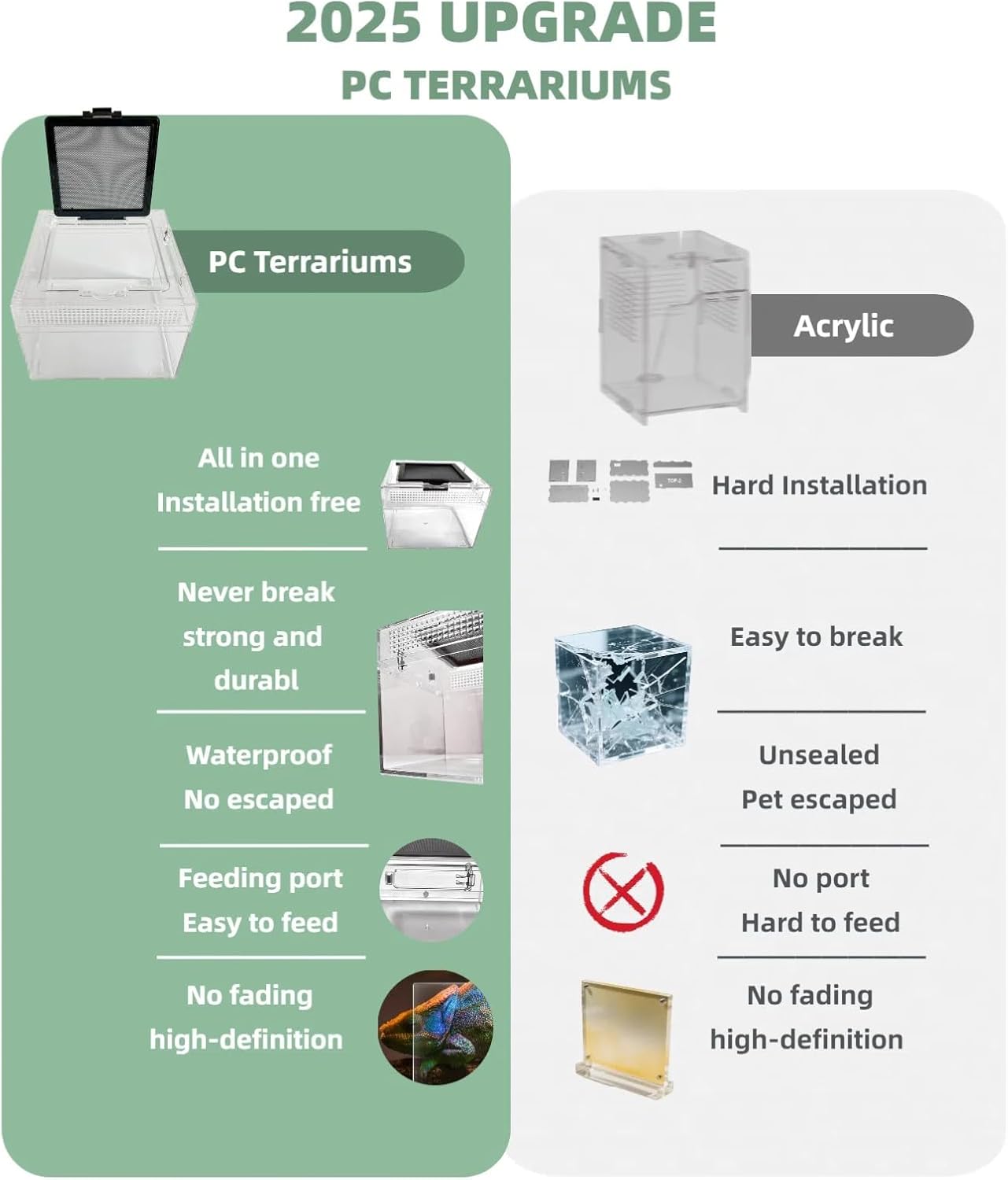 - 【360°Viewing Experience】:98% high-transparency PC resists yellowing over time, offering unobstructed views of your pets’ activities.—ideal for leopard gecko tanks, snake enclosures, or frog terrariums where every detail matters.