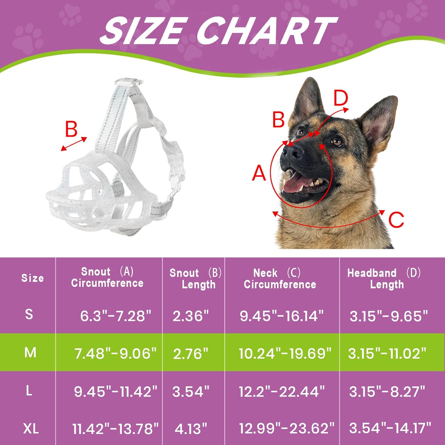 - PLEASE MEASURE BEFORE BUYING:Measure both snout circumference and snout length before purchasing. If your dog's snout length exceeds the size range by about 1 inch, choose the next size up. For long-snout breeds like Dobermans, make sure the snout length fits as well.