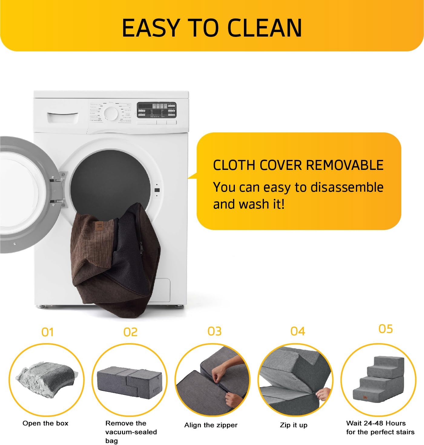 - 【Easy to Clean】: The dog stairs feature a removable, machine washable cover for effortless cleaning. Simply take out the foam core for washing; however, please avoid cleaning the foam and board. After removing from the compression bag, allow 24-48 hours for the foam to fully expand before use for optimal comfort