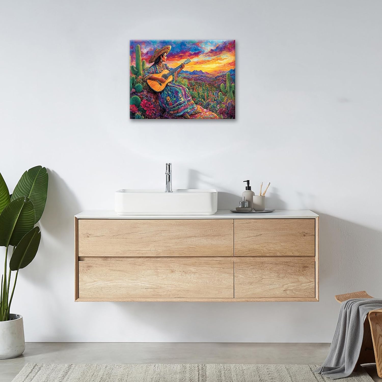 Mexican Women Pictures Wall Art, Cactus Landscape Bathroom Wall Decor, Nature Scenery Aesthetics Framed Painting Desert Modern Canvas Artwork for Bathroom Bedroom Living Room Decorations 20"L x 16"W