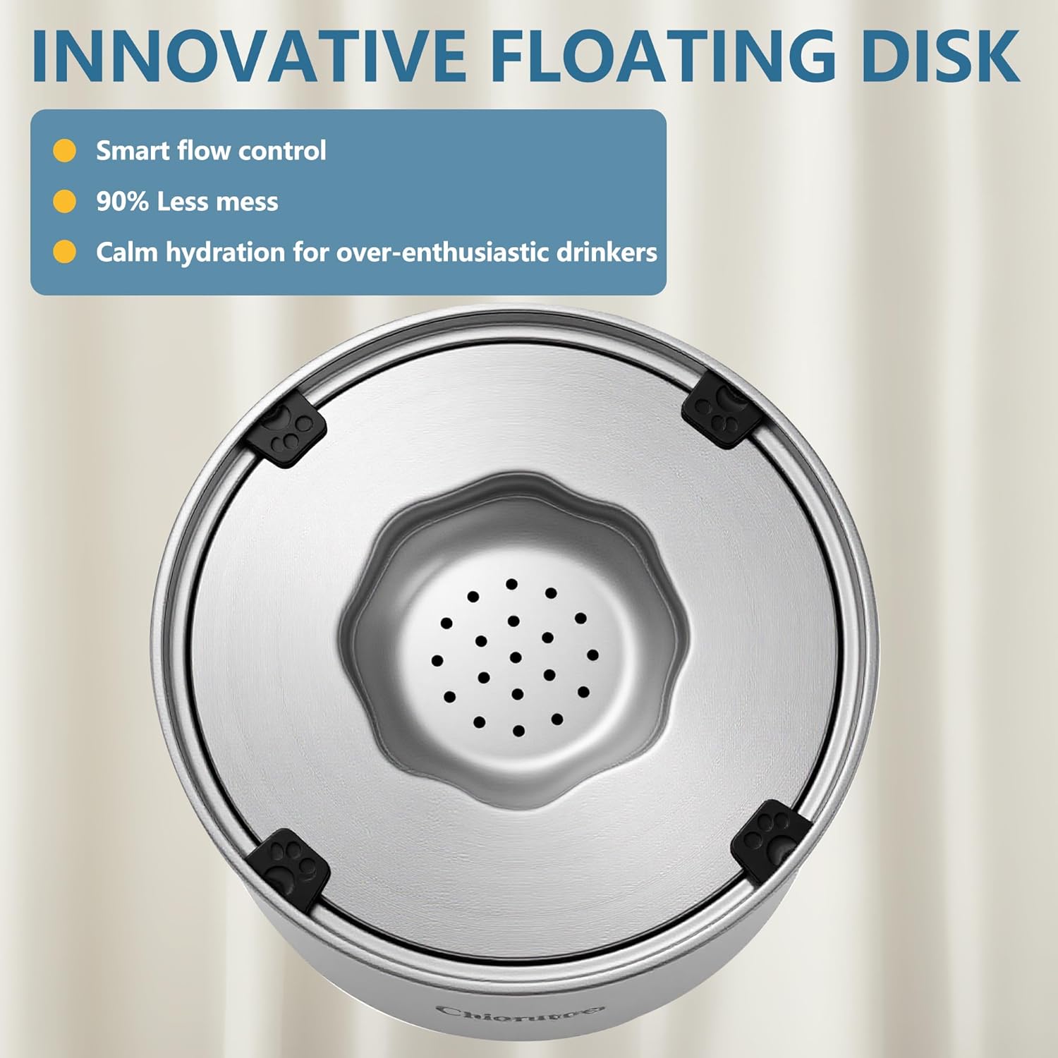 - Spill Proof : The Chioratree dog water bowl features an innovative floating disk design that automatically adjusts the water level to prevent splashing, keeping your space clean and dry at all times