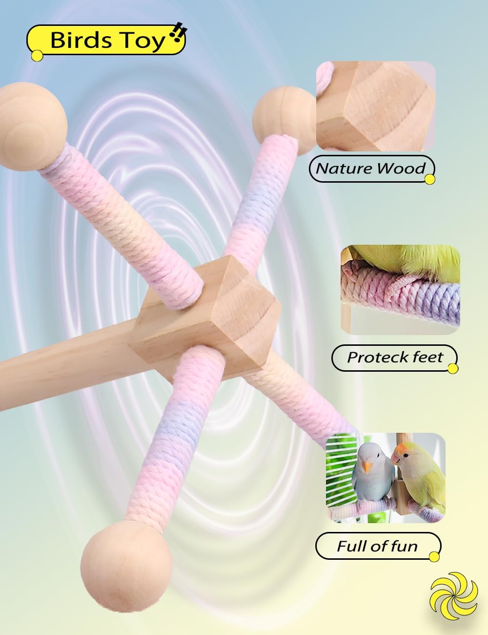 Bird Stand Perch Toy, 360° Rotating Natural Wooden Parrot Perch for Bird Cages, Colorful