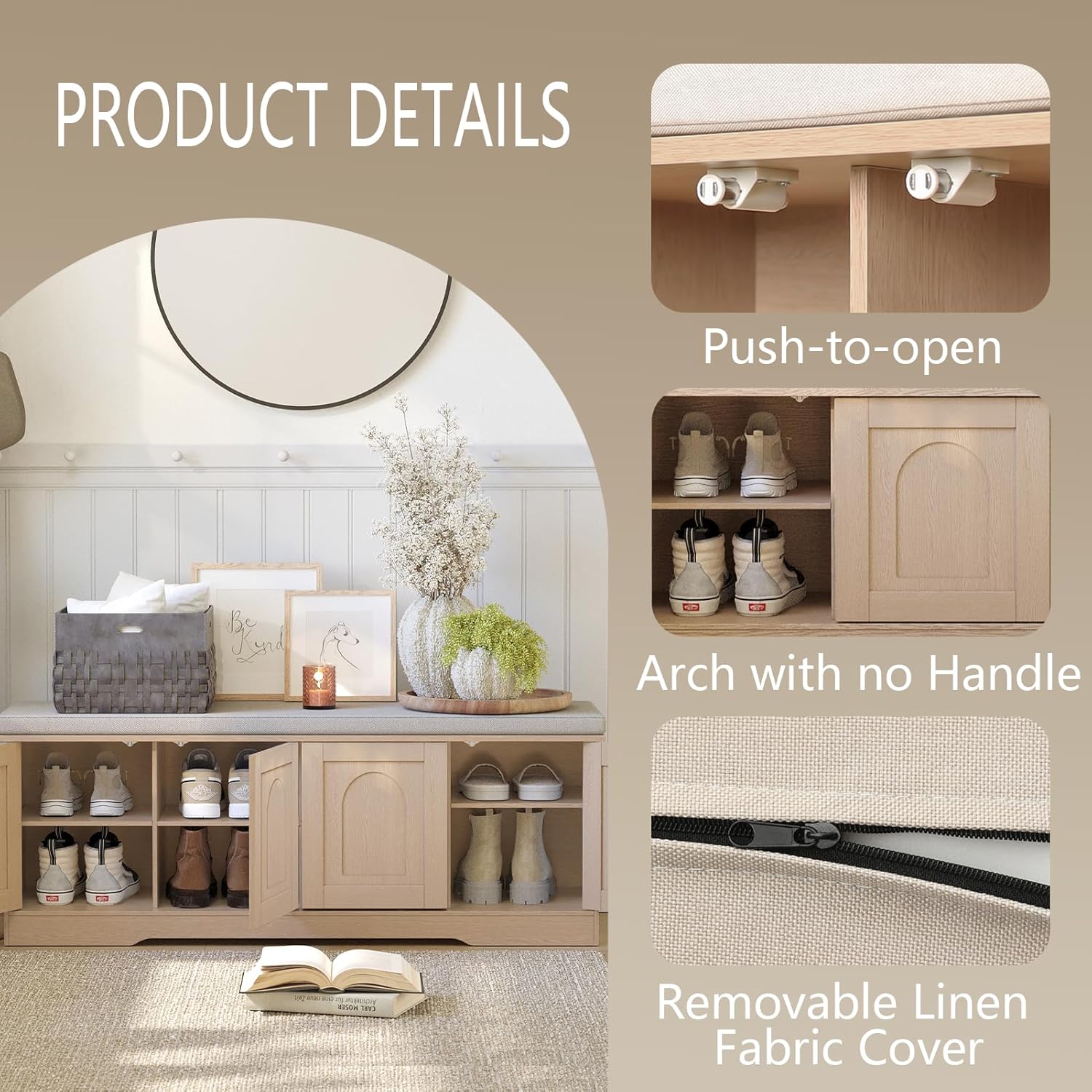 - 【Effortless Push-to-open door】Feature a fully enclosed design with a press-to-open mechanism, keeping shoes clean and tidy while avoiding accidental bumps against door handles during use. Reasonable height and soft cushion let you change shoes by sitting on the bench more comfortable without bending down or squatting