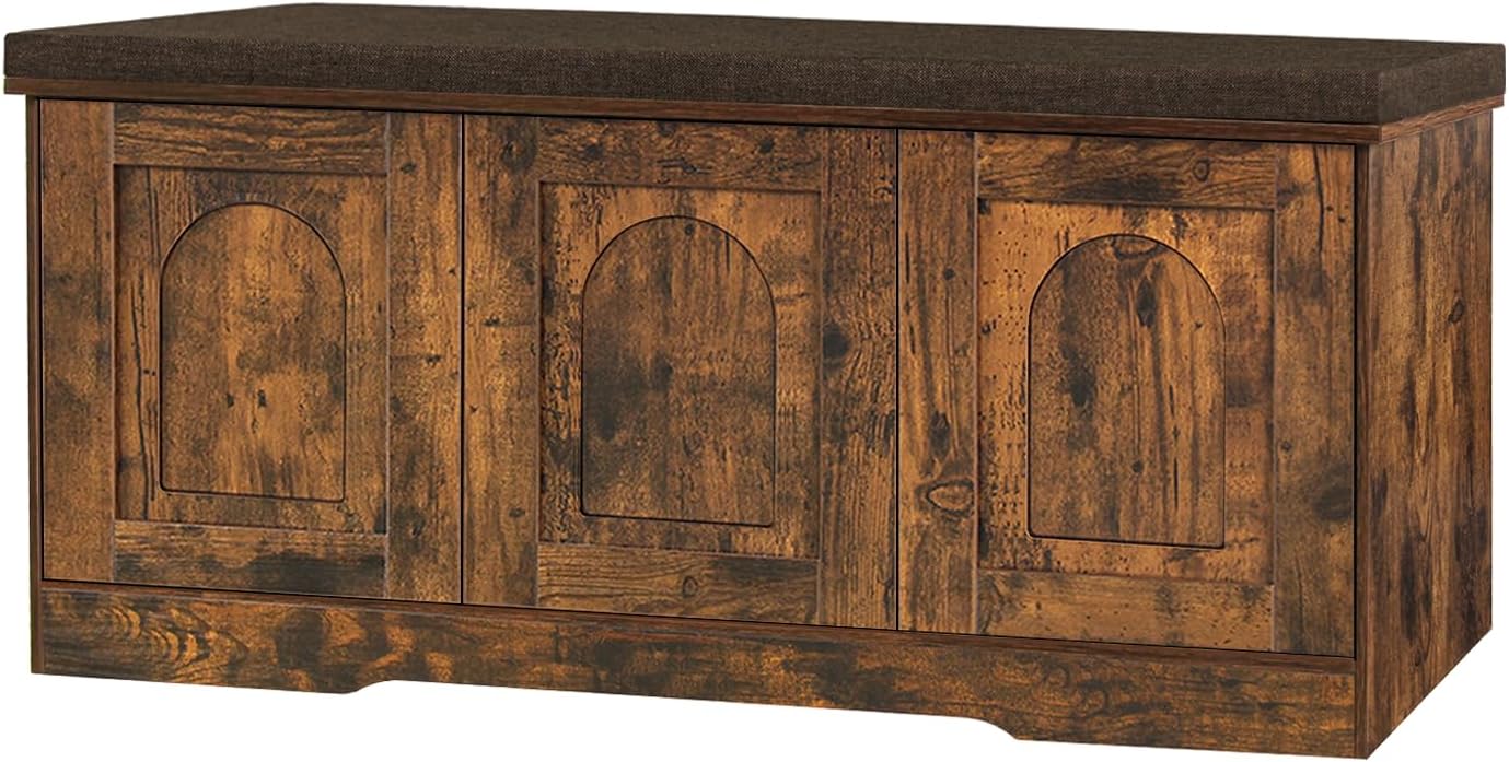 DINZI LVJ Shoe Bench, Entryway Storage Bench with Doors, Cushion, 2-Tier Shoe Rack with 6-Cubby, 39.4”L x 13.8”W Shoe Organizer Cabinet, Adjustable Shelf, Living Room, Bedroom, Rustic Brown