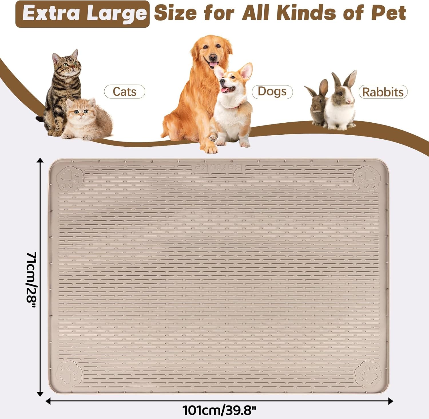 Cat Food Mat, 40" x 28" Extra Large Silicone Pet Feeding Mat with Raised Edge Pet Placemat for Food and Water Bowl Non-Slip, Easy to Clean, Floor Protection (Khaki)