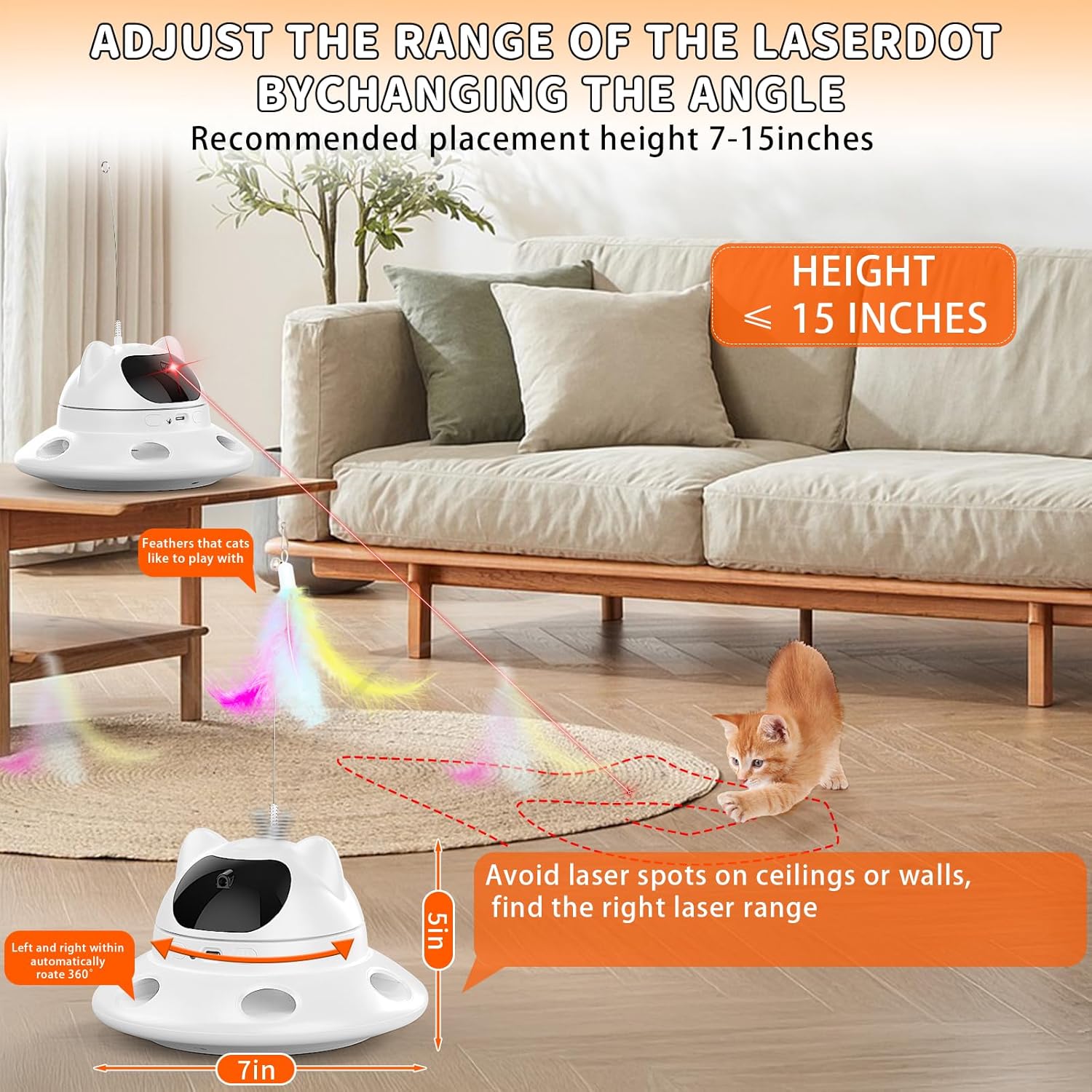 - ๐ฏ 3-in-1 Cat Laser Toys Unique dots, stars, butterflies, mice, smiling faces, laser patterns, automatic 360 ยฐ random laser trajectory, unpredictable red laser motion stimulates cats to chase and play. The head teasing cat stick bell feathers attract cats to slap, and feathers are randomly shot out from 6 holes to encourage your cat to pounce and slap. Perfectly matched with various scenarios, there is no need to worry about indoor cats hitting anything that may fall or break.