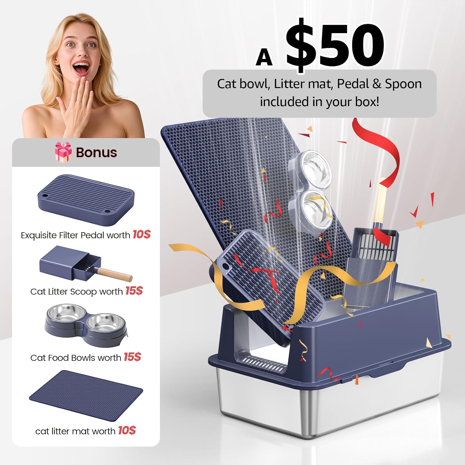 Stainless Steel Cat Litter Box - Enclosed XL Metal Kitty Litter Box with Lid for Big Cats, High Sided, Anti-Leakage, Easy Cleaning, Non-Sticky, Included Litter Mat, Cat Bowl & Spoon