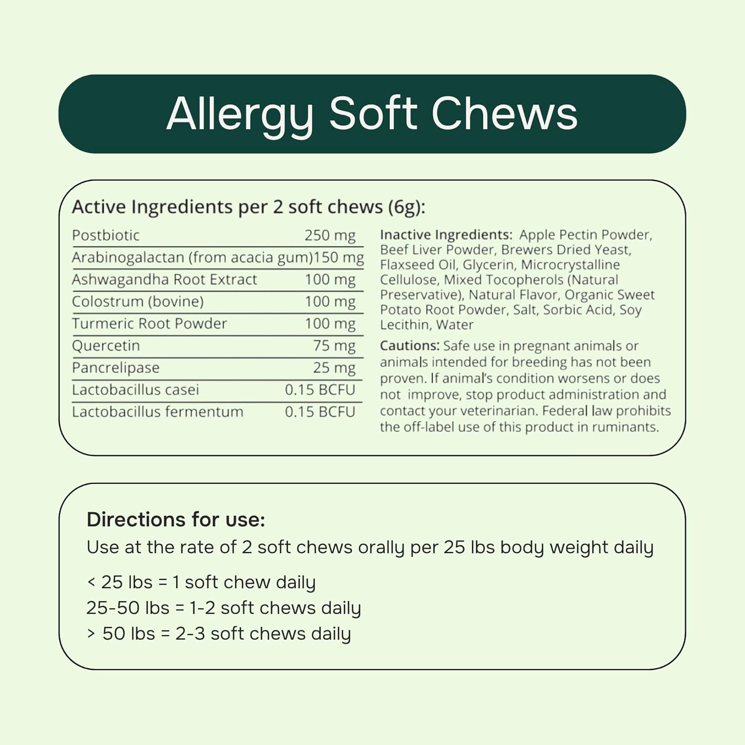 - Powerful Seasonal Allergy Relief – Formulated to help dogs combat environmental allergens and support respiratory function. These soft chews support relief from itchy skin, paw licking, scratching and biting.