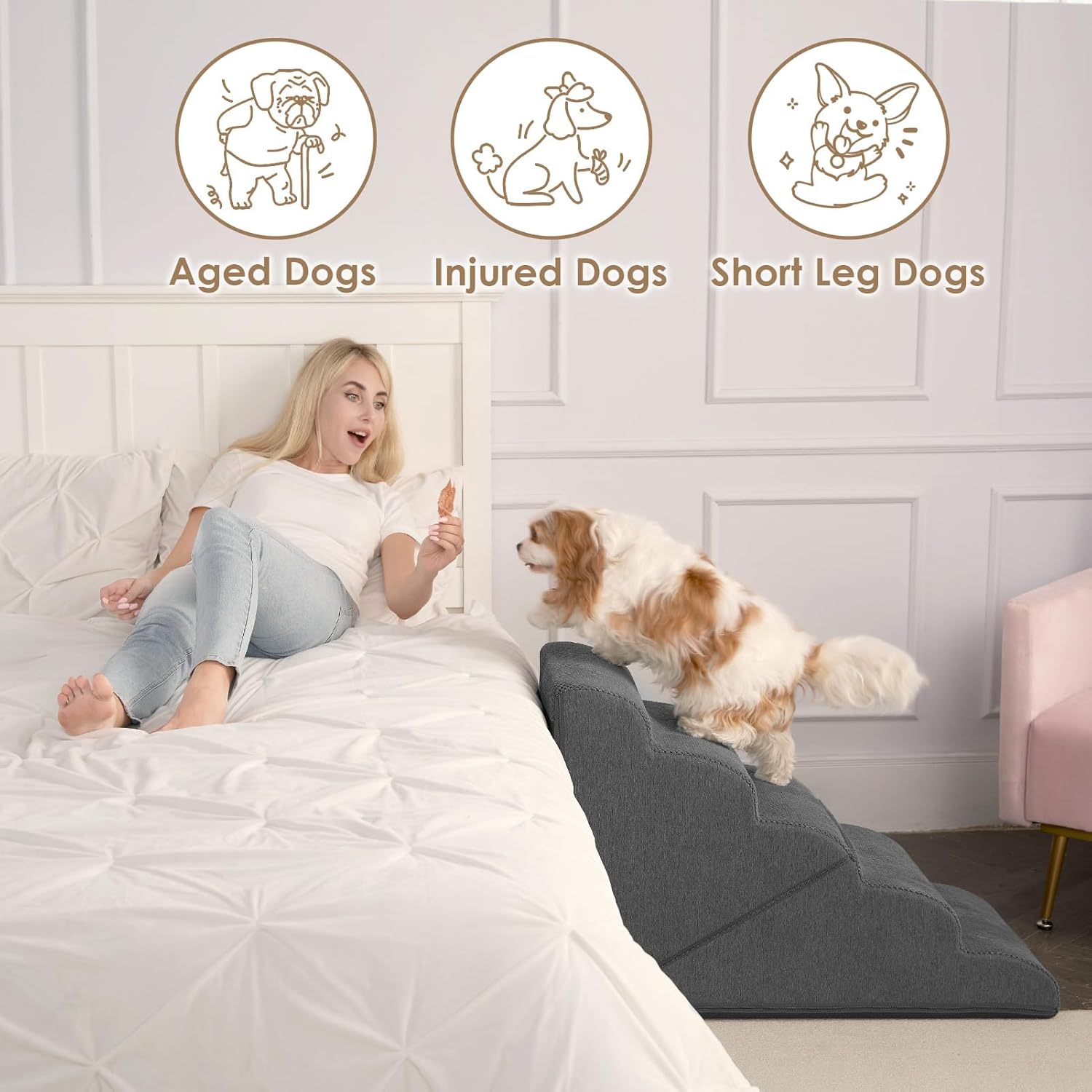 - SPECIFIC AND STEADY DESIGN - 33D density of pure foam make this stair more steady when your pets walk on. The dog bed stairs can provide strong support for pets in the walking process. Low angle slope design can better protect your pet's joints.