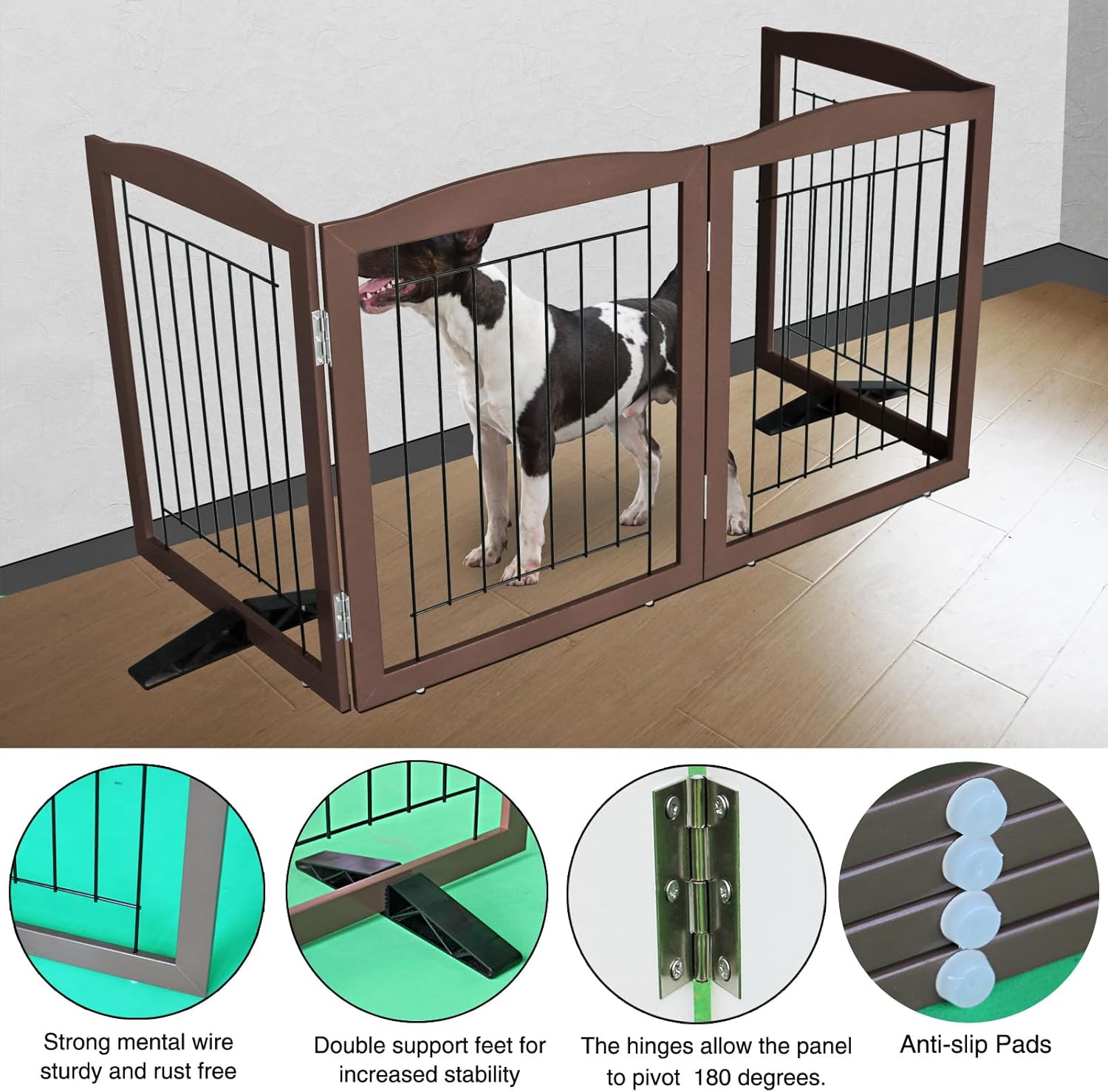 ZJSF Freestanding Dog Fence Indoor, Foldable Dog Gate for Doorways, Stairs or Hallways, Sturdy Wood Extra Wide Pet Gate with Support Feet for The House, Brown, 24 "Height-4 Panels