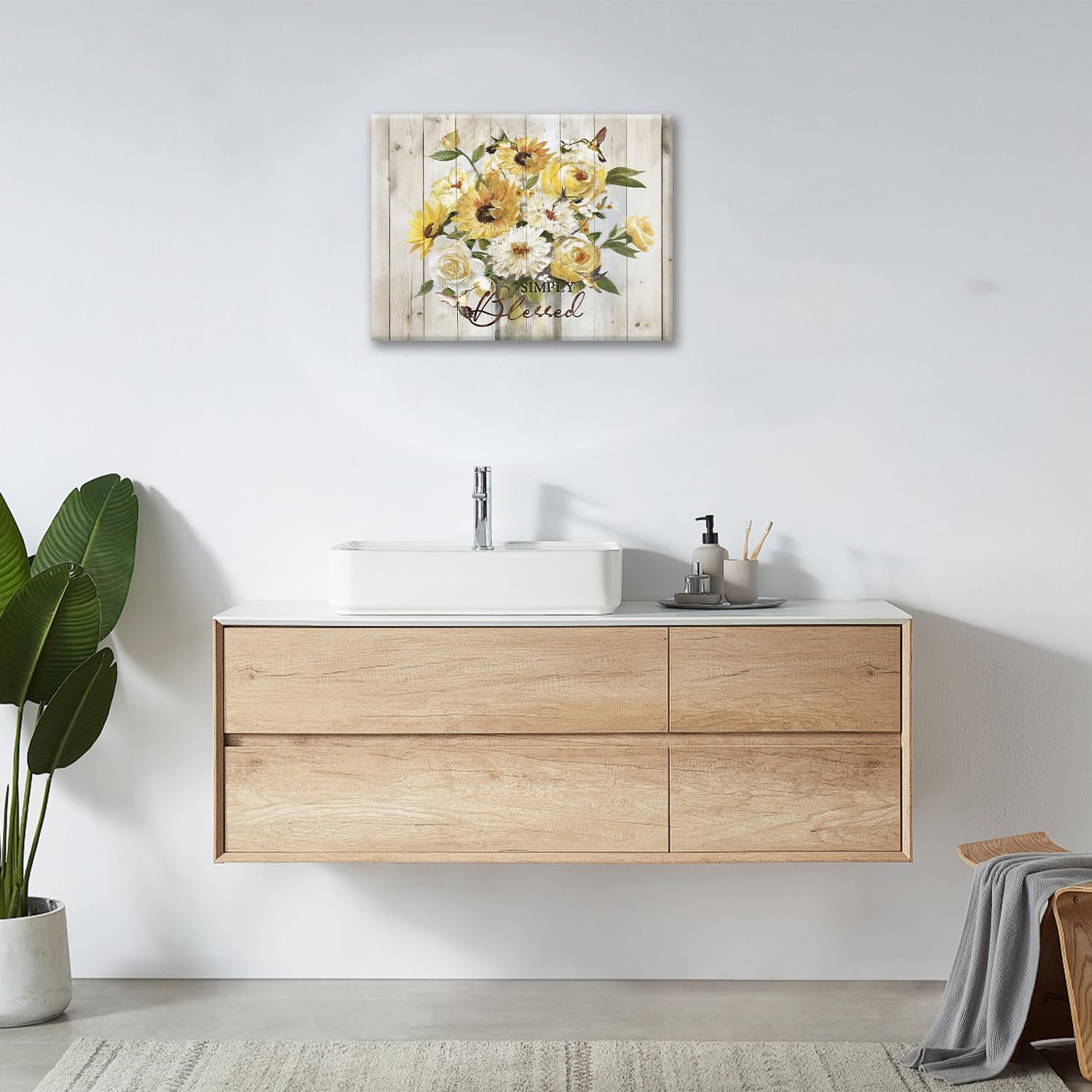 Sunflower Bathroom Pictures Wall Art, Simple Blessed Floral Bathroom Wall Decor, Flower Framed Painting Canvas Artwork for Bedroom Living Room Decorations 16"L x 12"W