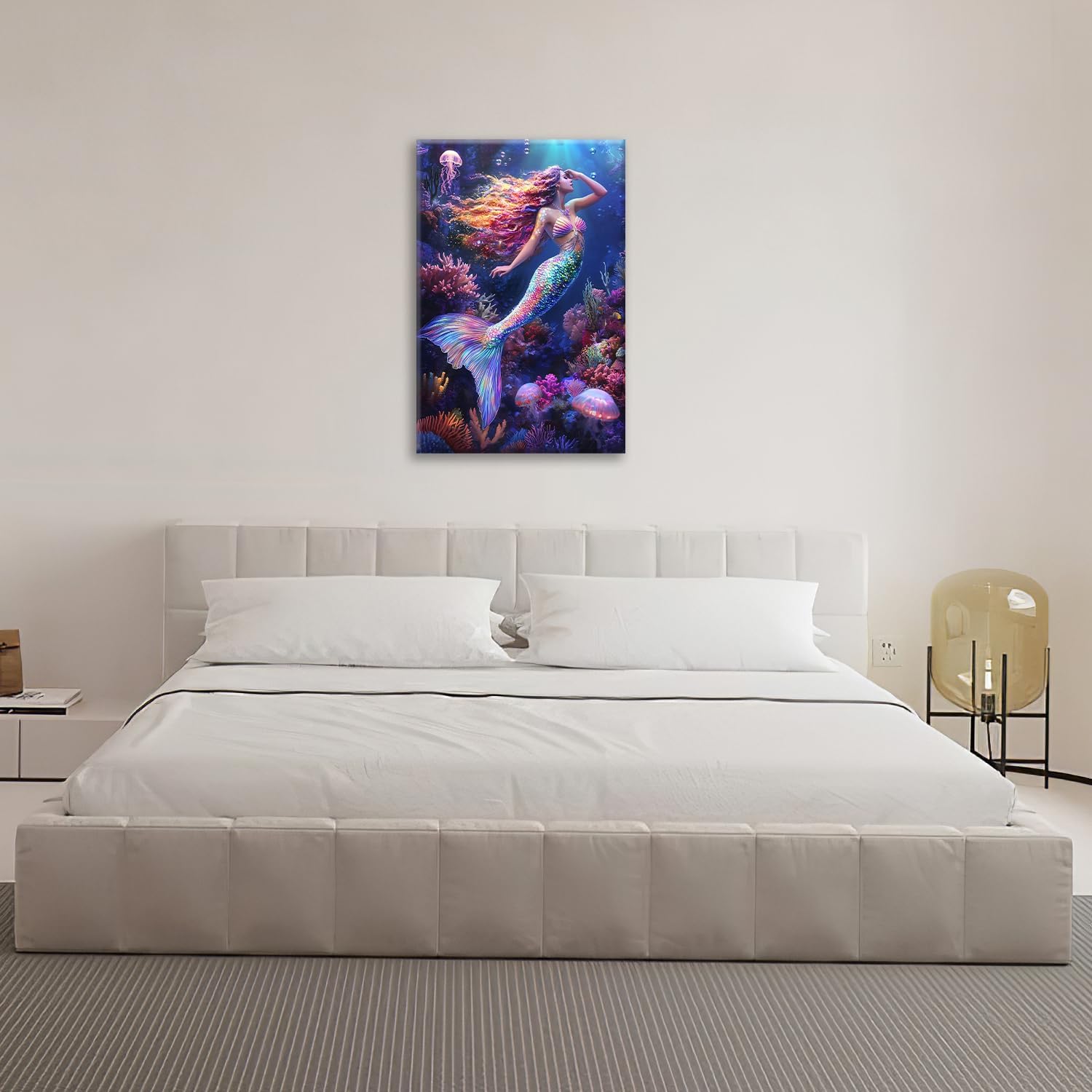 Sea Mermaid Bathroom Pictures Wall Art, Ocean Mermaid Bathroom Wall Decor, Aesthetics Framed Painting Canvas Artwork for Bedroom Living Room Decorations 24"L x 16"W