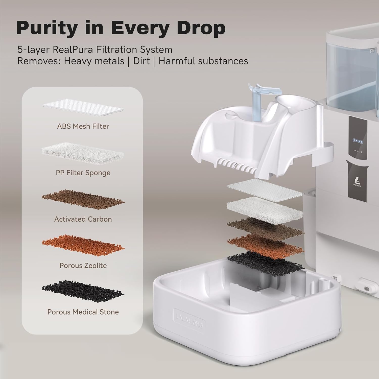 - Cleaner Water with the Unique 5-Stage Filtration: LALAHOME cat drinking fountain stands out with 5-stage filtration system: Water gets pre-filtered through a mesh screen, trapping hair and gunk in a sponge filter. Then it’s pushed through activated carbon, zeolite, and finally cleaned by the maifan stone. It can effectively filter and diminish the hair, impurity, odor, and chlorine. The filtered water dispenser can give cleaner water to pets and reduce the risk of developing illness.