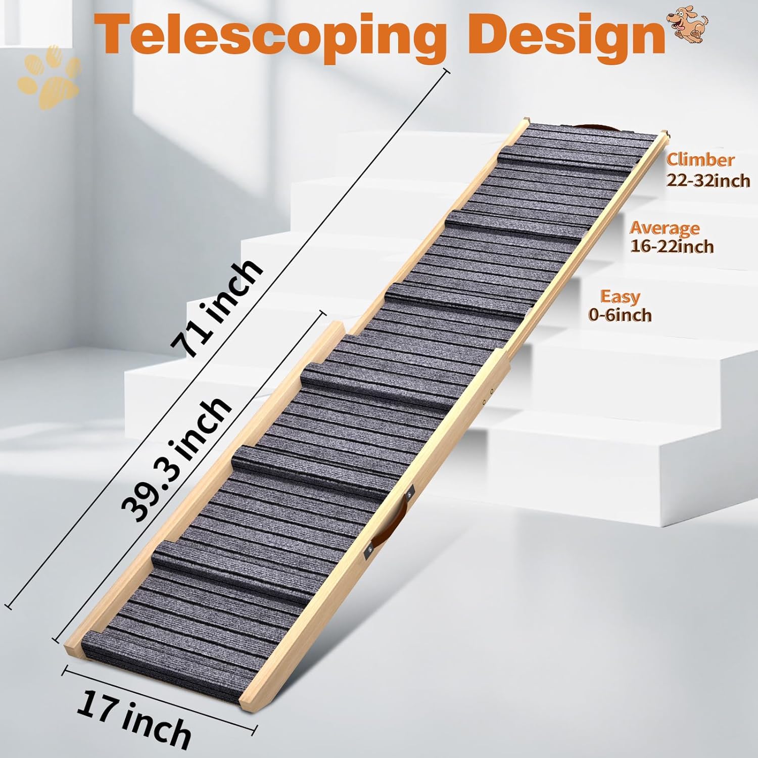 Dog Ramp for Car, 71''x 17'' Extra Long Deluxe Telescoping Design Wooden Pet Ramp, Pet Stair Ramps for Truck SUV with Non-Slip Surface, Portable Outdoor Dog Steps for Medium Large Dogs, Up to 250LBS