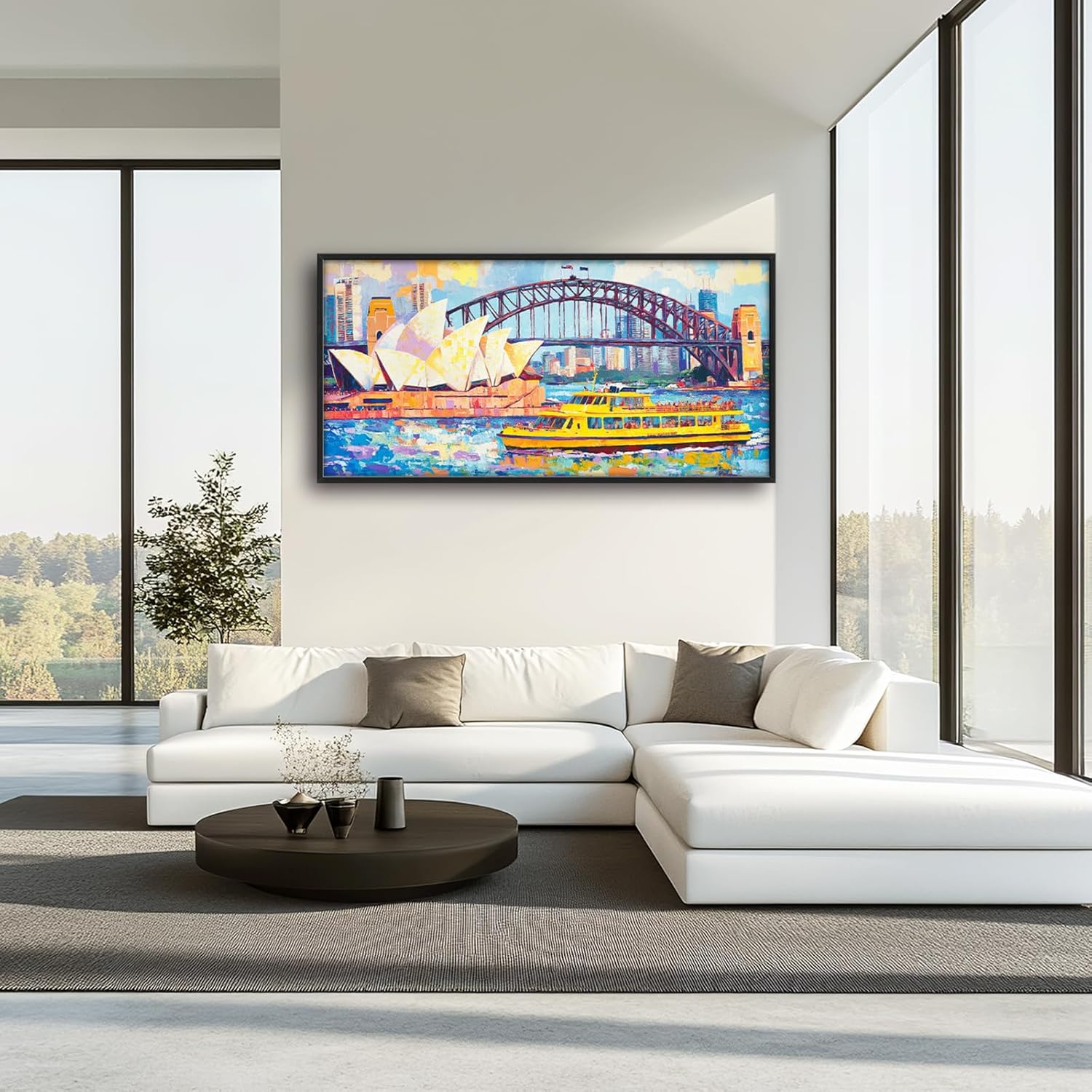 - 【Unique Design】 A vibrant painting of the Sydney Opera House and Harbour Bridge, with an iconic yellow ferry in front. The scene is set against a backdrop of city buildings, capturing the essence of urban life.