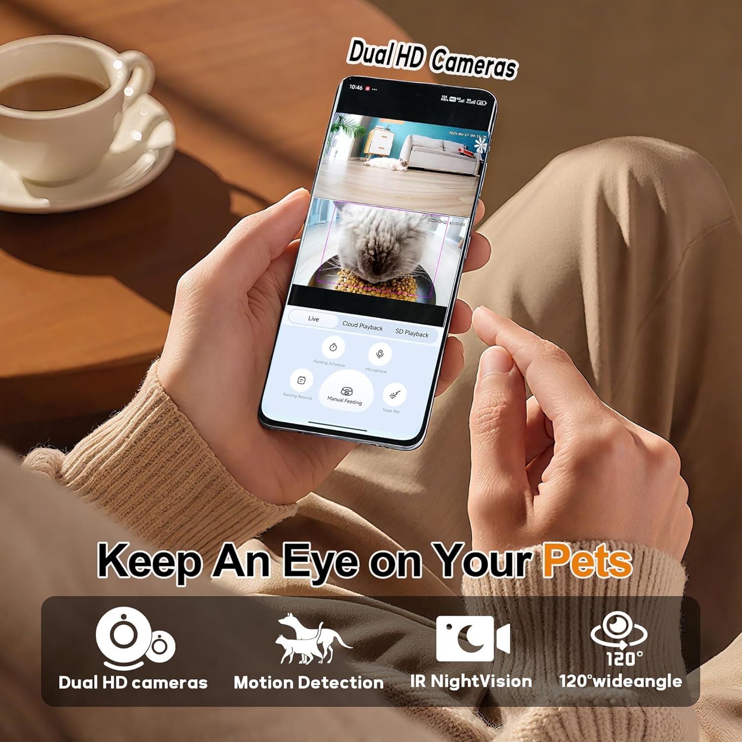6L Automatic Cat Feeder with Dual Camera, 1080P HD Night Vision & Dual Power Supply, Easy Setup Timed Food Dispenser with Desiccant Bag for Cats & Dogs, 5G WiFi Pet Feeder with 2-Way Audio