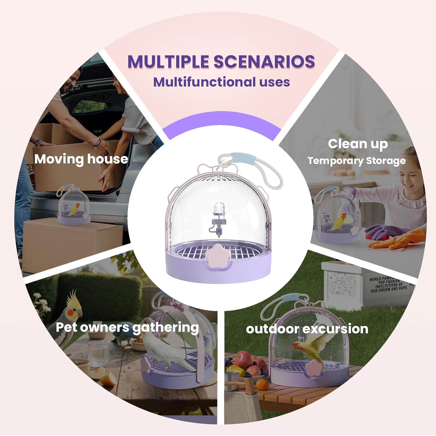 - 【Vivid shape and Quality Materials】Our travel carrier cage features a unique dome shape. Transparent all around, making every cute moment of your pet invisible. The cage is made of delicate PS material, stains is not easy to adhere, safe and durable, one wipe can remove stains. Every corner is polished smooth and flat. Safe and comfortable living environment for small pets, large angle opening and closing design makes cleaning easier.