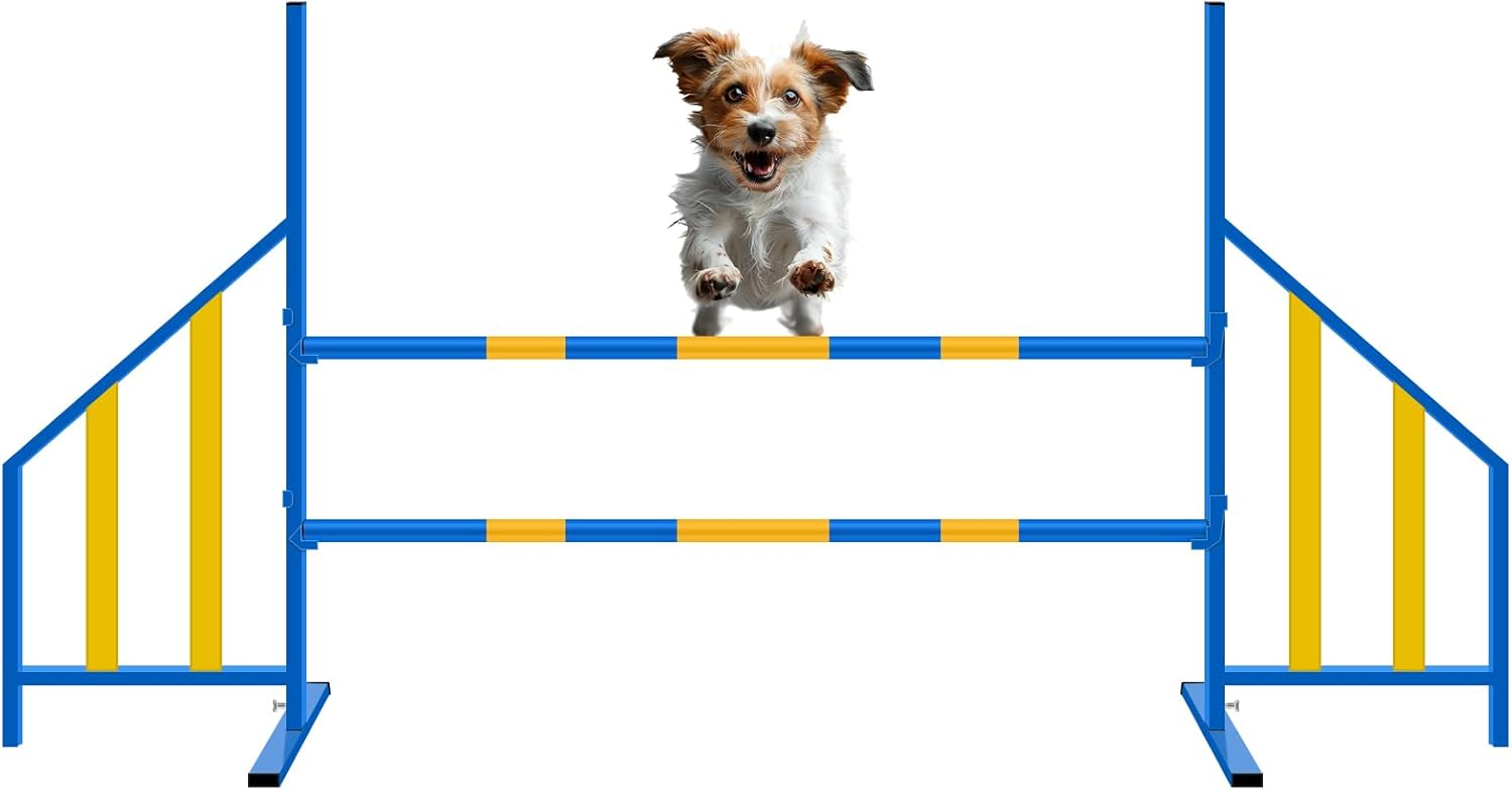- Adjustable Height: the height of our training equipment is 100Cm/39.37in, the width of each bar is 40cm/15.75in, the length of the jump bar is 120cm/47.24in, and the height range of the two jump bars can be adjusted from 0-65cm/3.94-25.6in, which allows your pet to start training from low to high and gradually improve self-confidence