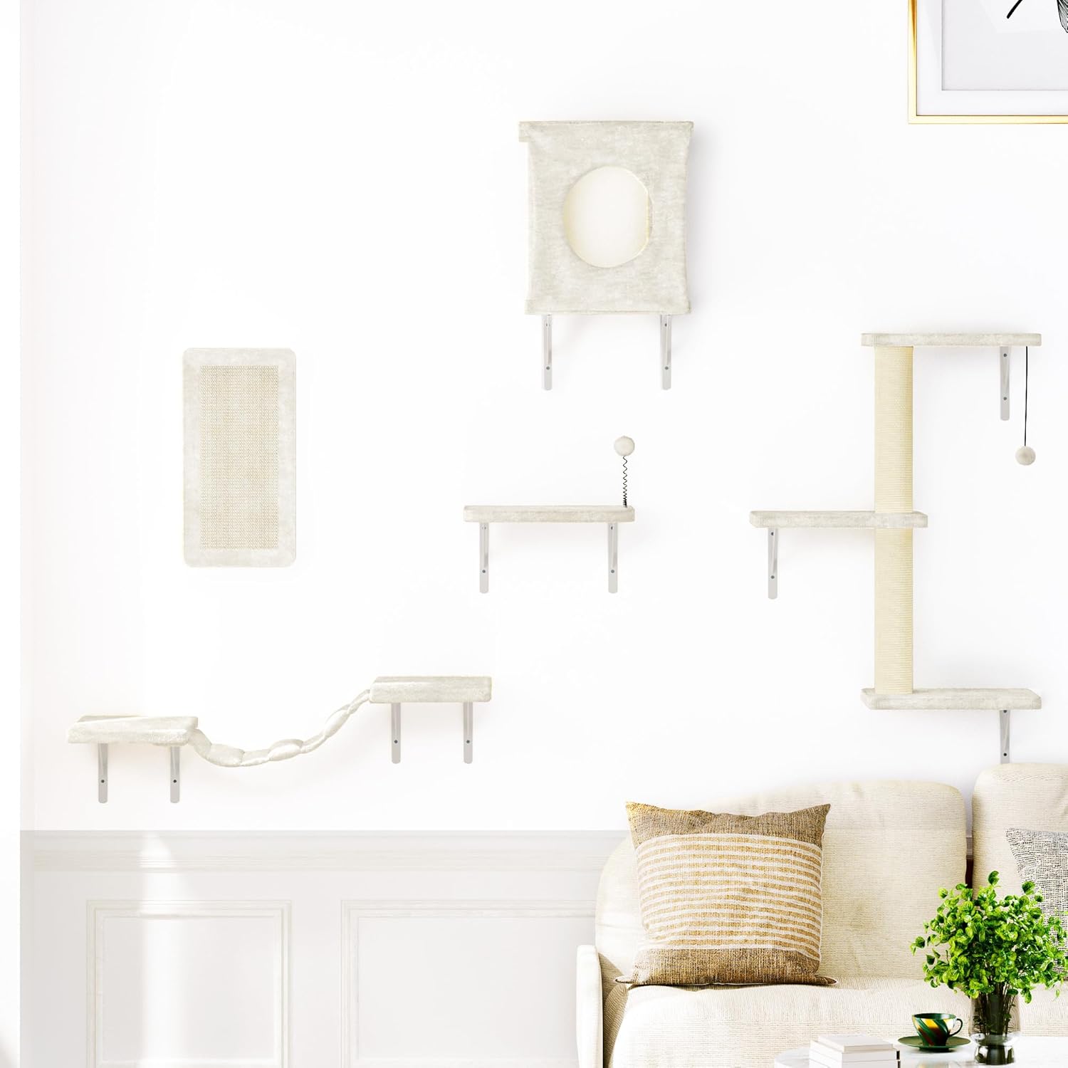 NUNU LAB Wall Mounted Cat Furniture, 5 Pcs Cat Wall Shelves with House, Bridge, Steps, Scratching Post, Shelves, Indoor Safe & Stable Furniture for Kittens Play, Beige