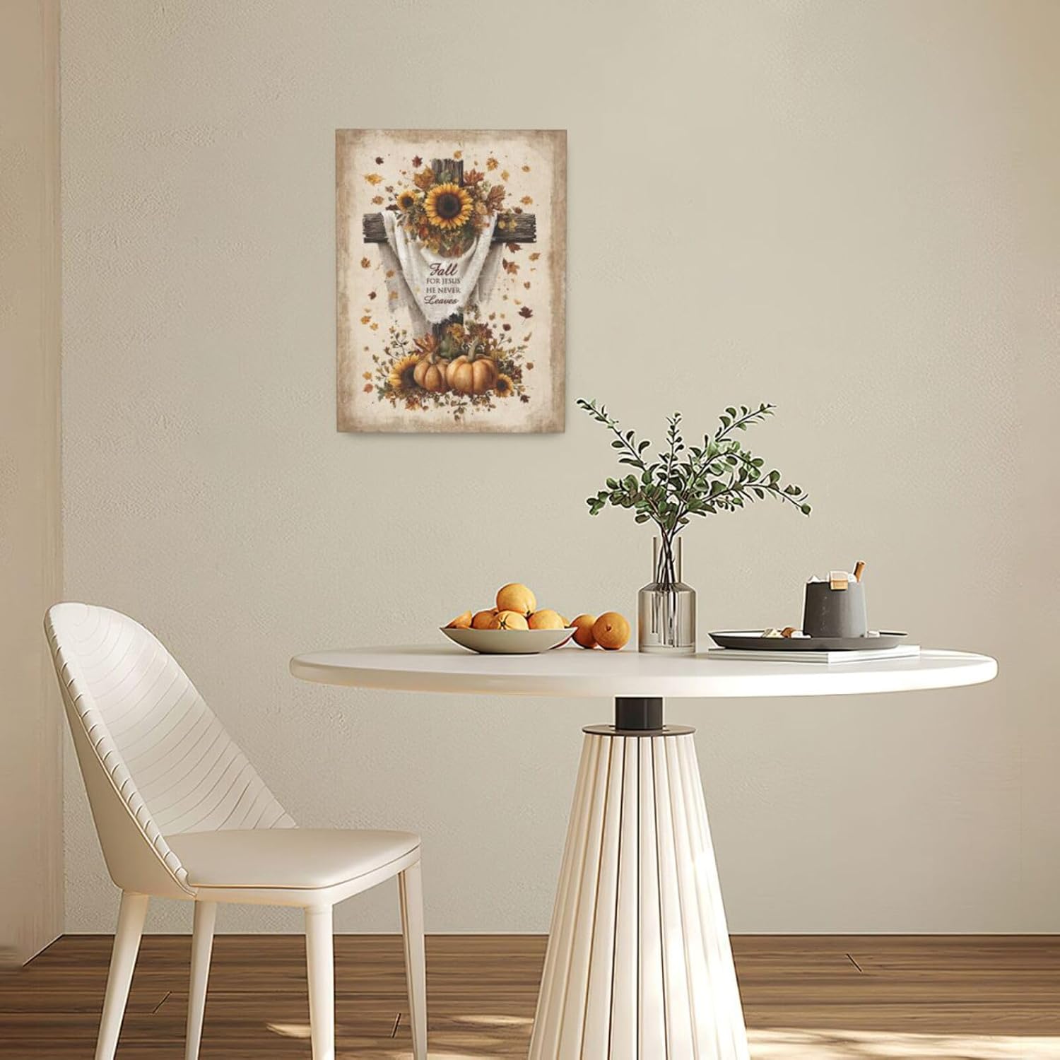 Christian Fall Wall Art Autumn Rustic Cross Sunflower Pumpkin Wall Decor Fall for Jesus He Never Leaves Pictures Painting Print Framed Artwork Decorations Gifts for Living Room Bedroom Prayer Room Office 12"x16"