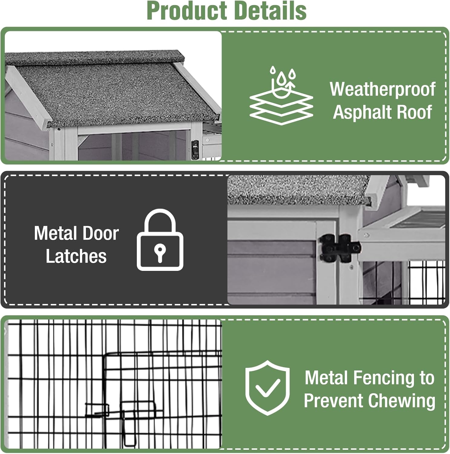 - Durable and Secure: Constructed with a metal frame and metal door latches, the cage ensures robustness and the safety of your pets. The metal fencing design prevents pets from chewing, extending the lifespan of the cage. The waterproof asphalt roof offers additional protection against harsh weather conditions.