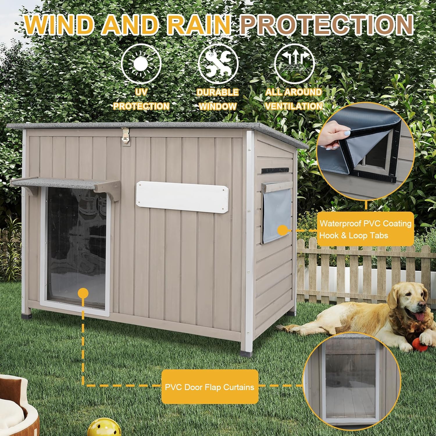 - 【Durable Design for Indoor & Outdoor Use】Crafted from solid fir wood with a weather-resistant asphalt roof, this outdoor dog house offers long-lasting protection and comfort. Built to withstand sun, rain, and wind—perfect for backyard, patio, or deck