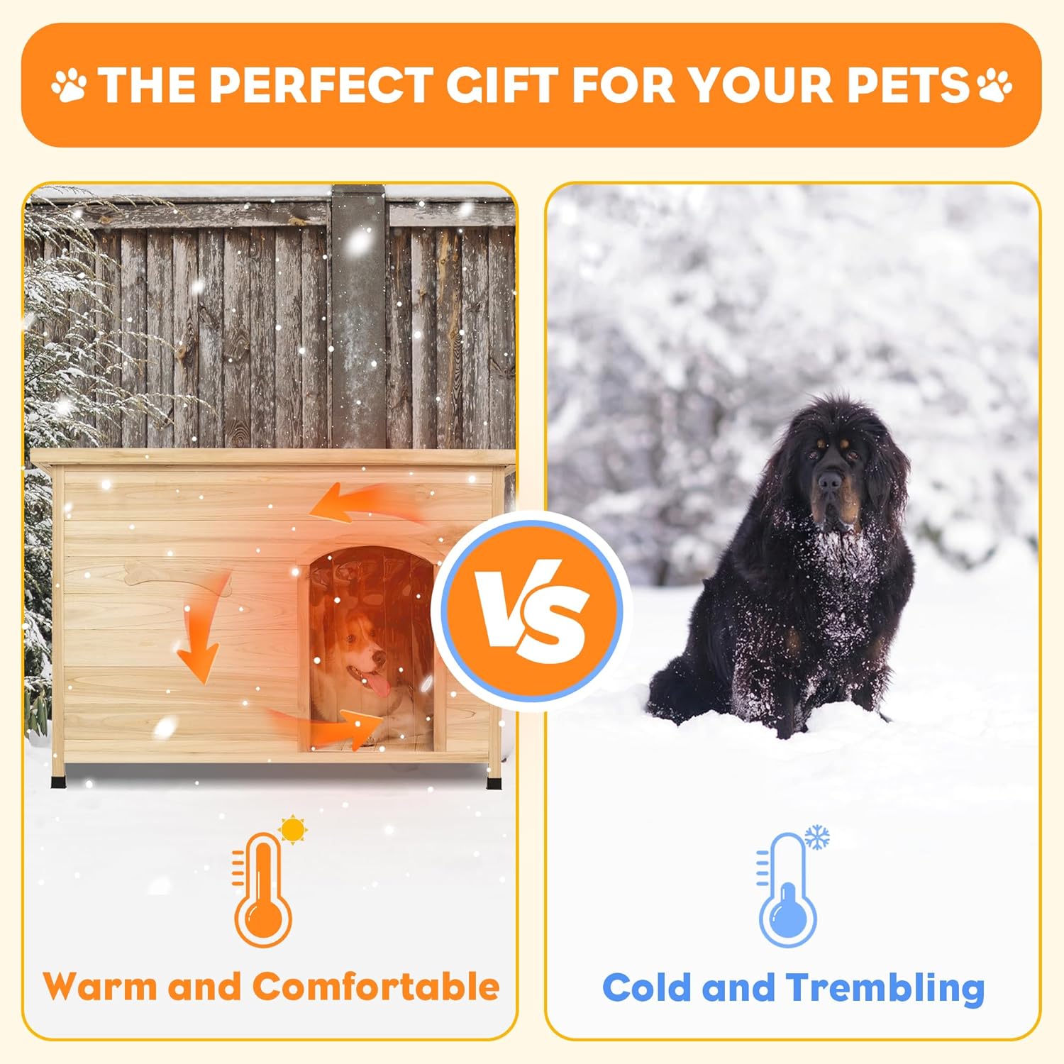 - [Specially Designed for Outdoor Use] The sloping asphalt roof is expertly engineered to prevent rainwater from pooling, ensuring that your pet's living space remains dry and comfortable. The floor is 2.4ββ above the ground, and there is a removable PVC curtain and adaptable floor pads for uneven ground. This design enables the dog house to withstand harsh weather conditions, preventing water from seeping in and materials from getting damp