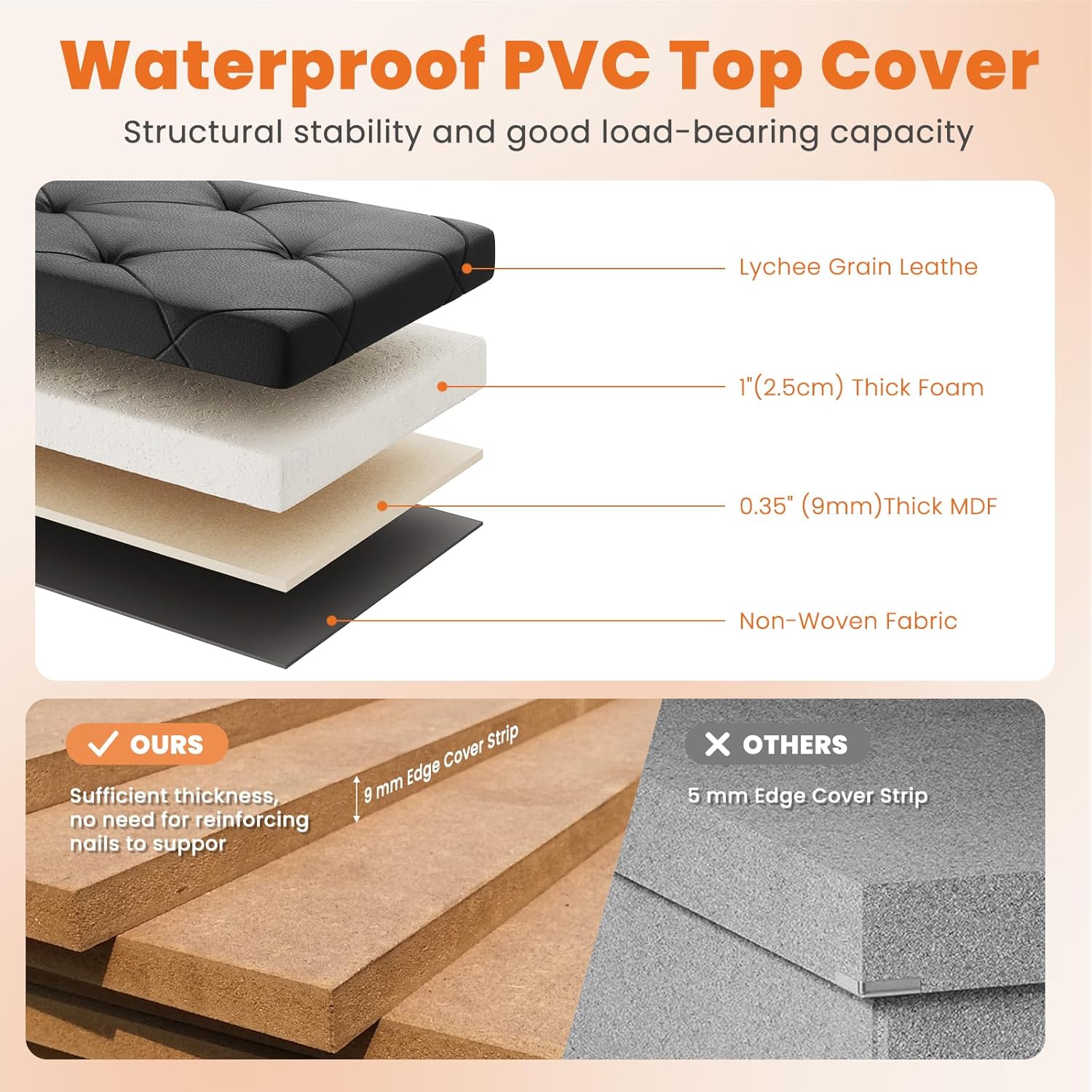 - ăPremium & Durable BuildăThe black Sweetcrispy storage ottoman features chic Lychee Grain Leather, while brown uses sleek Synthetic Leatherâboth super comfy and built to last. No flimsy stuff here! We use 4 layers of reinforced material with 9mm-thick edges, supporting up to 660 lbs without extra nails. Just sturdy Sweetcrispy quality!