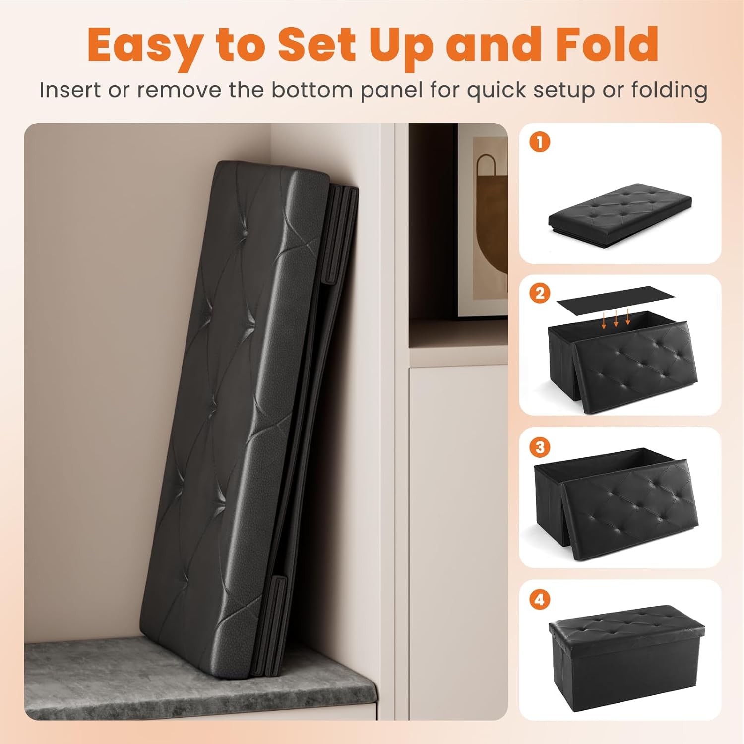 - ăSets Up in Seconds & Saves SpaceăDonât sweat assembly! Your Sweetcrispy ottoman with storage folds flat when youâre done using itâslide it under your bed, prop it in a closet, or stash it anywhere. Seriously, unfold â snap the base â load it up â done. Thatâs it!
