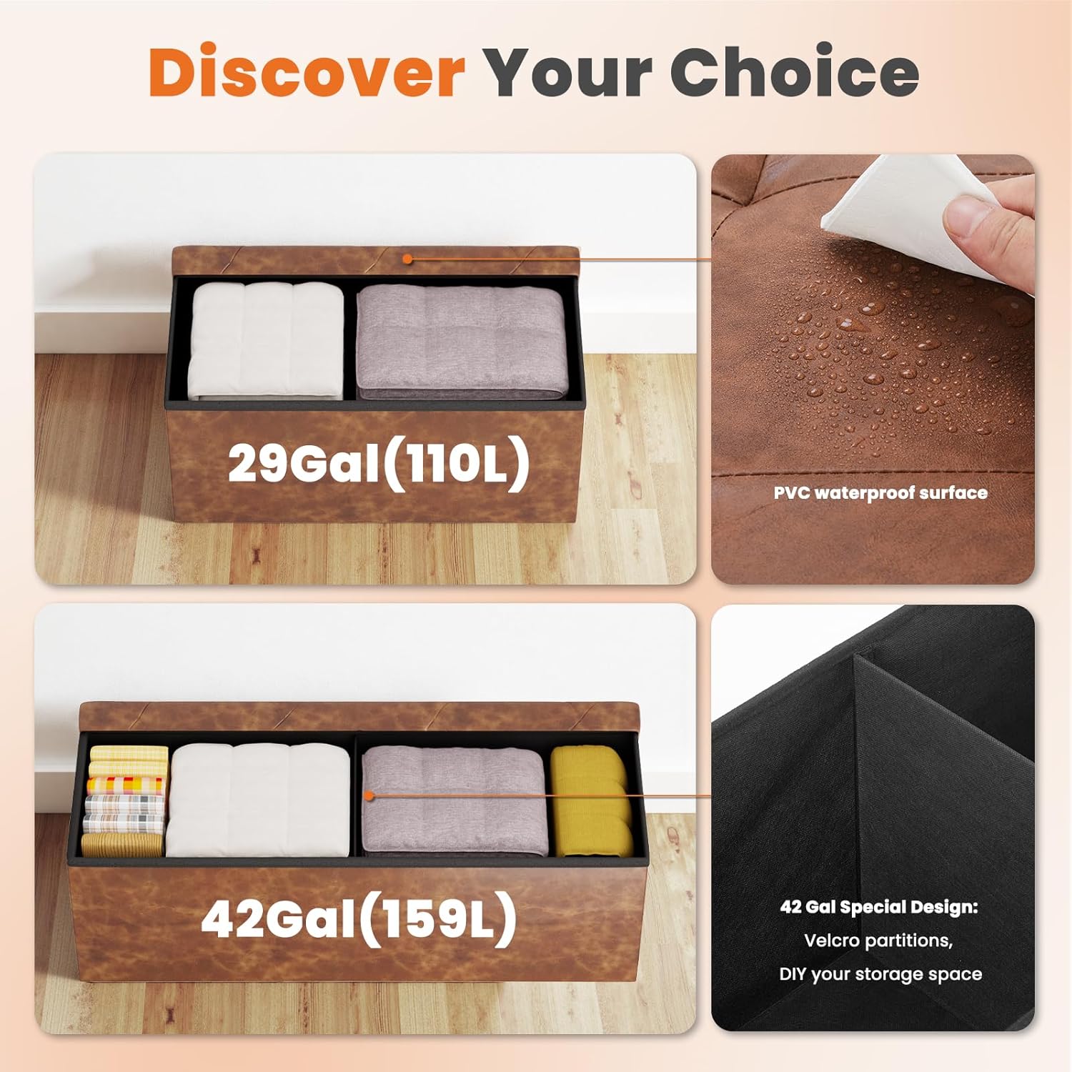 Sweetcrispy 30 Inches Folding Ottoman with Storage Bench, Foot Rest Stool, End of Bed Storage Bench Upholstered, Load 660 lbs, for Living Room, Synthetic Leather, Brown
