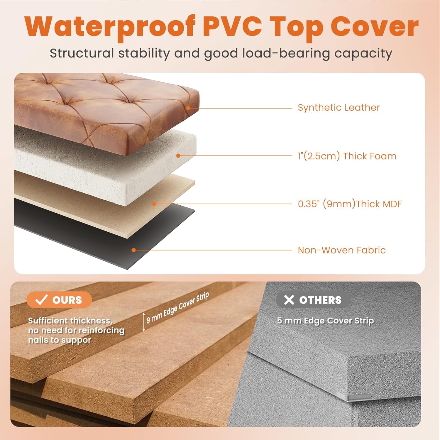- ăPremium & Durable BuildăThe black Sweetcrispy storage ottoman features chic Lychee Grain Leather, while brown uses sleek Synthetic Leatherâboth super comfy and built to last. No flimsy stuff here! We use 4 layers of reinforced material with 9mm-thick edges, supporting up to 660 lbs without extra nails. Just sturdy Sweetcrispy quality!