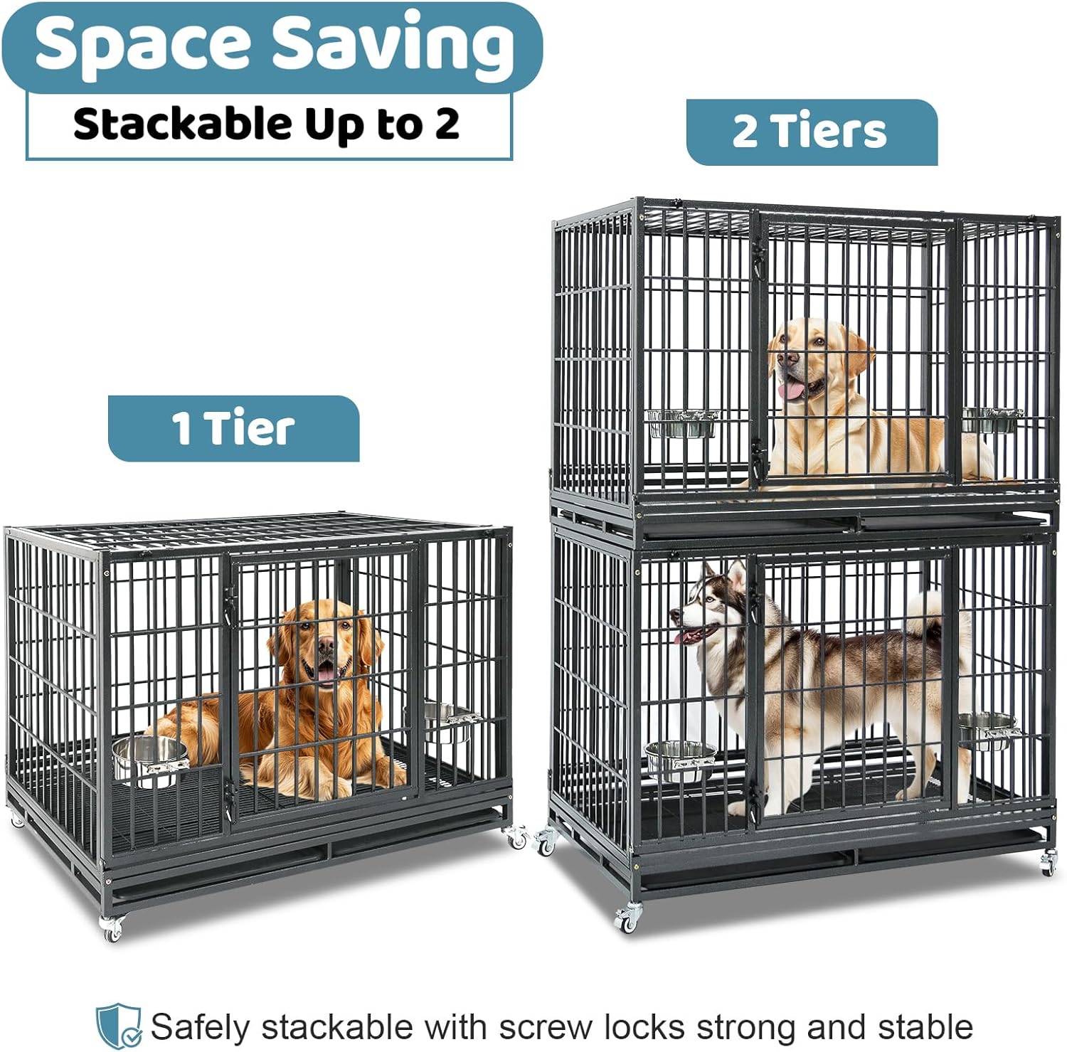 48 Inch Heavy Duty Dog Crate, Indestructible Escape Proof Big Cage for High Anxiety Large Dogs, Stackable & Collapsible XL Dog Kennel Indoor with Wheels,Dual Trays,Adjustable Bowl,Top Access