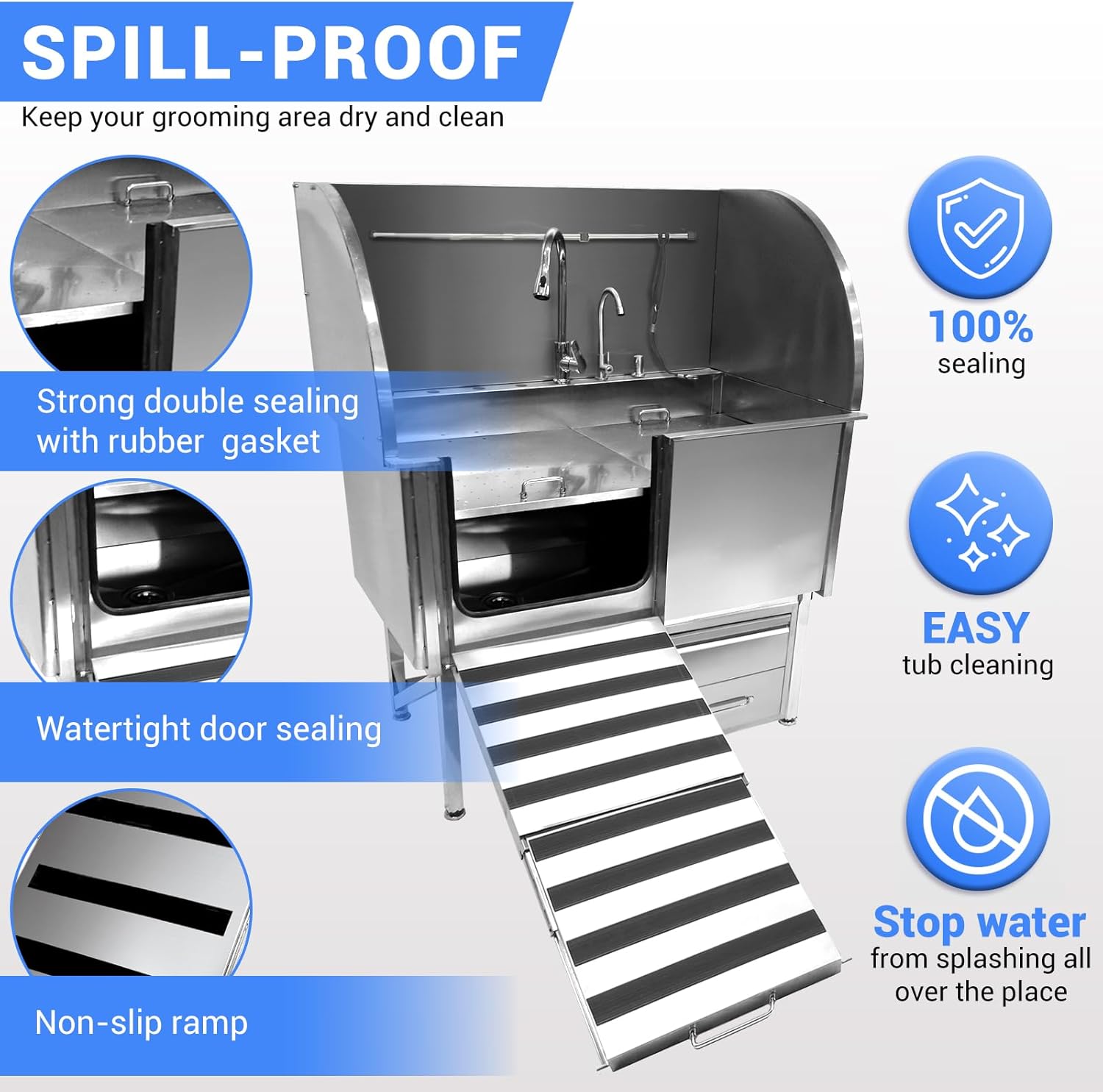 - Spacious Tub with Smart Storage: 50βx30.7βx58.7β size fits all dog breeds. Includes a large sliding drawer to organize towels, shampoos, and grooming tools for a clutter-free bathing area.
