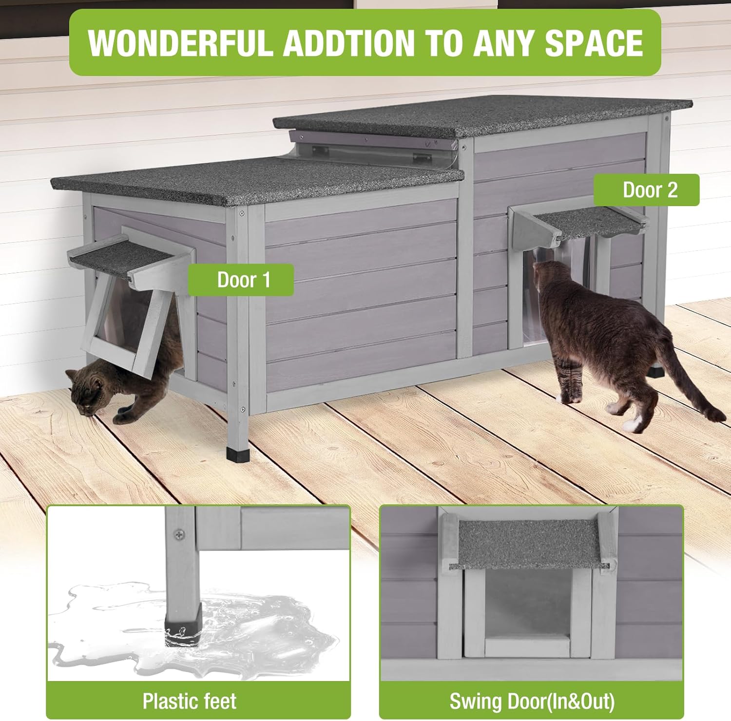 - Spacious Dual-Room Design Measuring 39.1"L x 18.5"W x 19.1"H, this outdoor cat house offers ample space for 2β3 cats or small animals. Its two-room layout and large opening roof provide comfort and easy access for multiple pets.