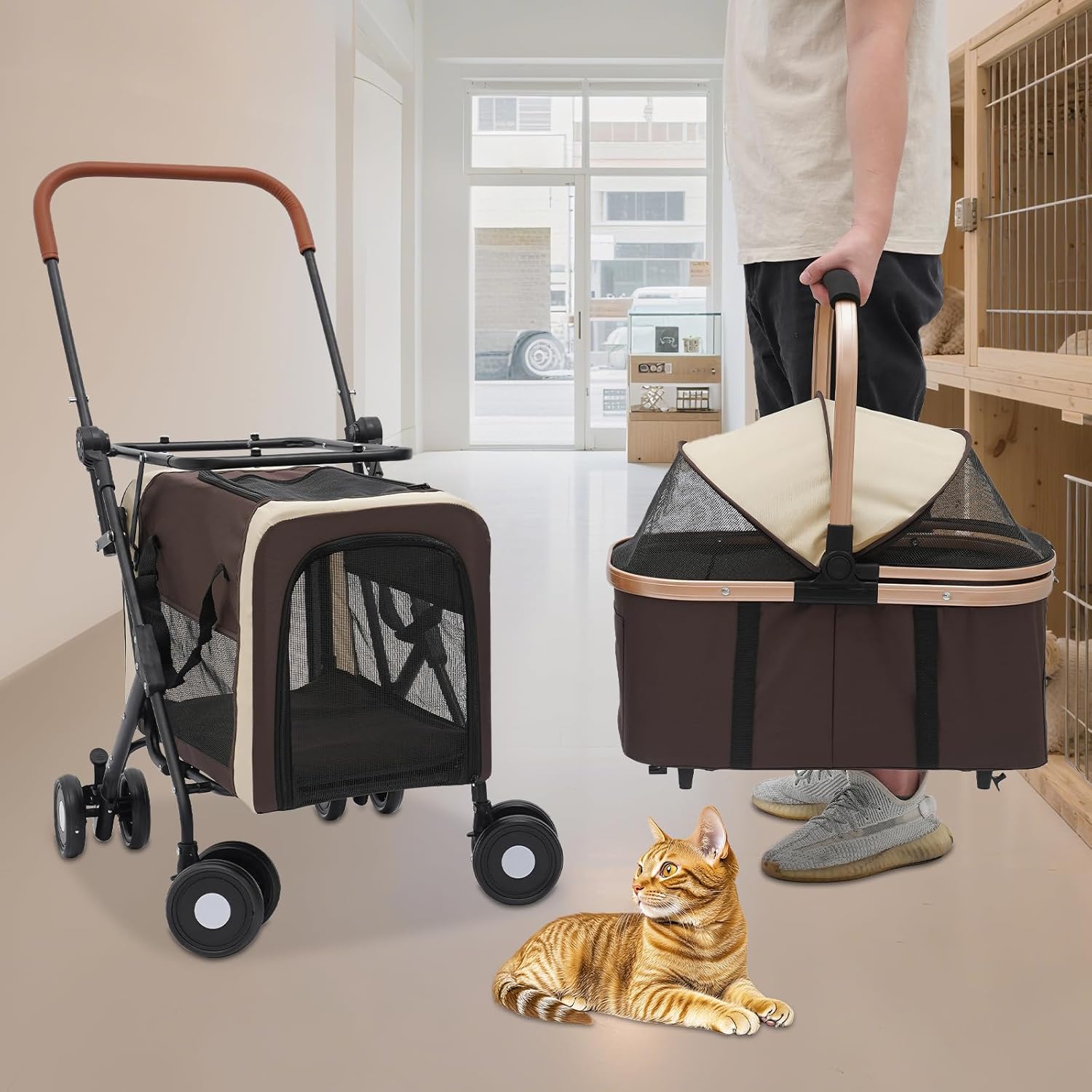 Foldable Pet Stroller for Small & Medium Dogs, Double Dog & Cat Stroller with 3-in-1 Travel System, Detachable Pet Carrier with Wheels for Cats and Dogs up to 77 lbs, Coffee Color